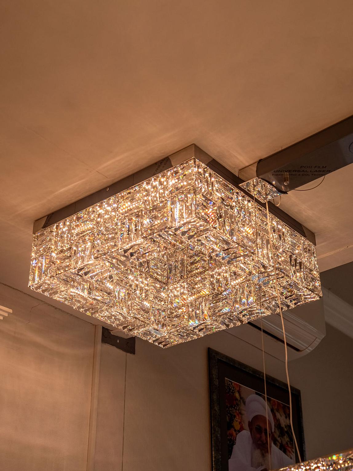 Command attention with this expansive 710mm square ceiling fixture, featuring a magnificent "crystal cube" brick arrangement. Crafted with premium K9 crystals and a mirror-polished stainless steel frame, this low-profile 200mm design delivers a high-brilliance, multi-dimensional glow for grand rooms with standard ceiling heights.