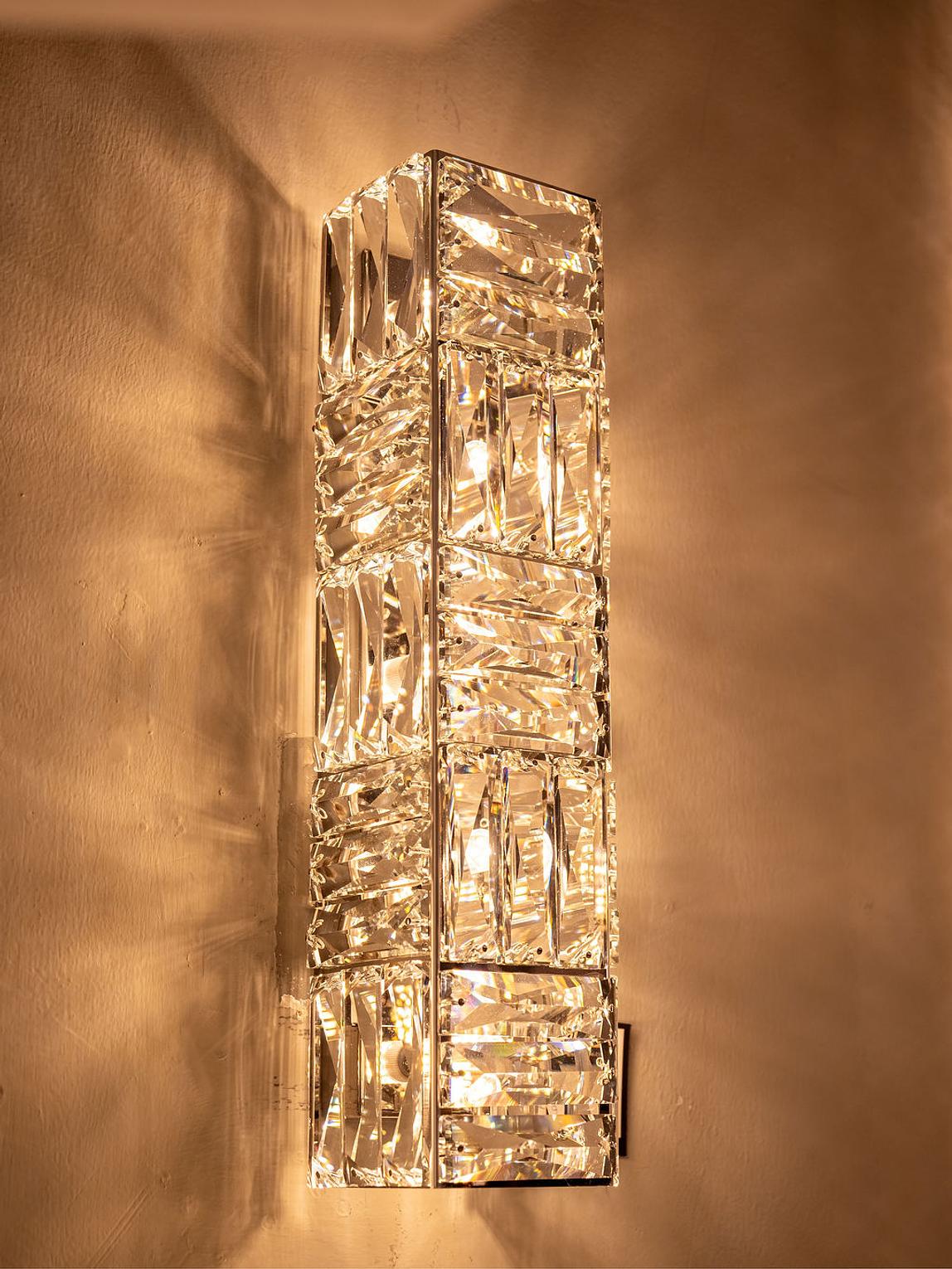 The 110380105 Stainless Steel K9 Crystal Wall Lamp is a refined lighting fixture that balances minimalist modern design with the brilliant sparkle of high-quality crystal. Measuring 380mm in height with a very slender 110mm width, this vertical sconce is specifically designed to add a layer of luxury to narrow wall spaces or to be used in repetitive sequences along grand hallways. The frame is constructed from high-grade, mirror-polished stainless steel, providing a durable and tarnish-resistant housing for the precision-cut K9 crystals. These crystals are engineered to maximize the light output from the four G4 bulbs, creating a radiant, multifaceted shimmer that adds depth and texture to your walls. With a compact 105mm depth, it offers a discreet yet high-impact lighting solution that blends seamlessly into contemporary, transitional, or upscale hotel-style interiors.