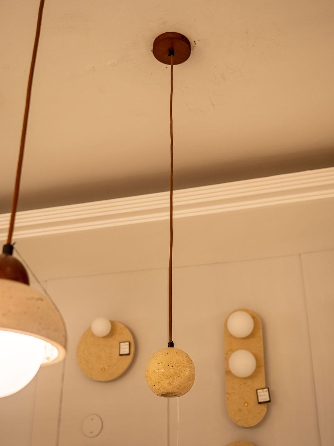 A modern pendant lamp crafted from travertine marble and fitted with a GU10 bulb for directional lighting